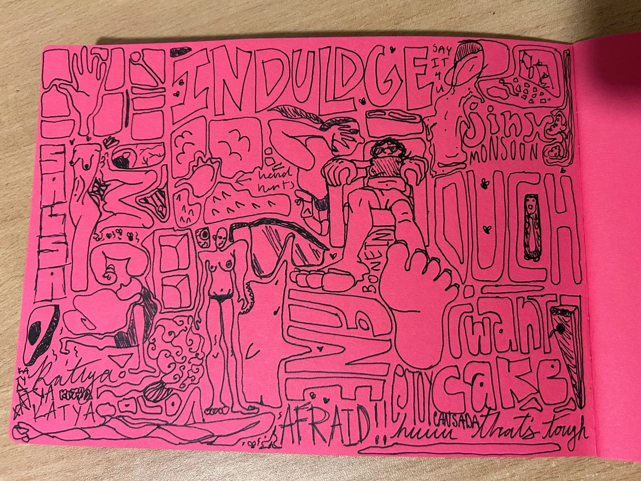 Speaking of talking to myself, here is the only art i’ve been able to make here. My brain is fried from the move. I guess all of the pink duct tape I used to fix my door hook and the way I have figured out how to arrange my room are also art. The way I have managed to shave my calves in the dorm shower is actually my greatest artistic feat of the month.